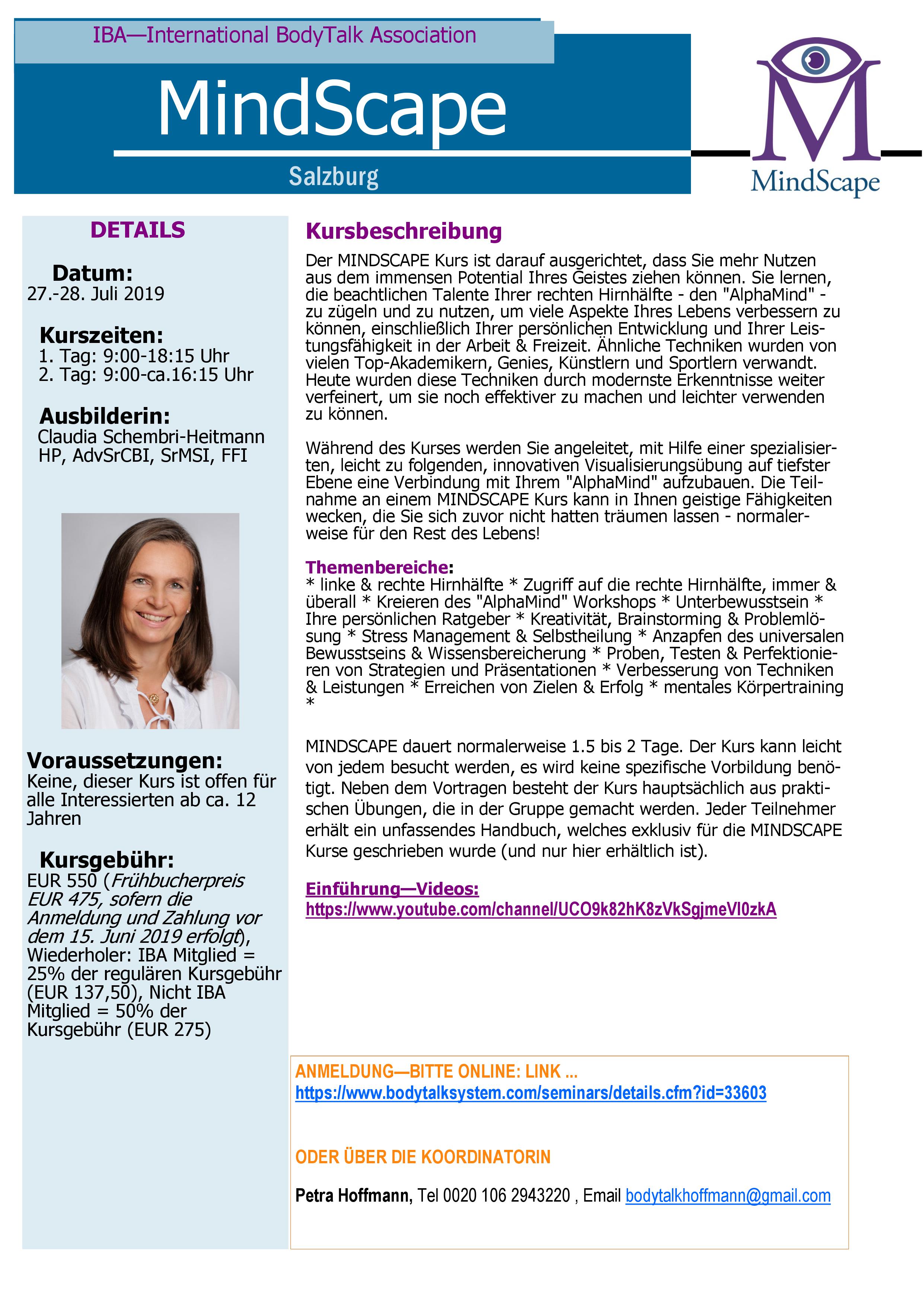"MindScape" ist ein Wochenendkurs, in dem die TeilnehmerInnen angeleitet werden, die enorme, aber meist ungenützte intuitive Kraft des Geistes zu "erwecken" und Techniken zu erlernen, die den